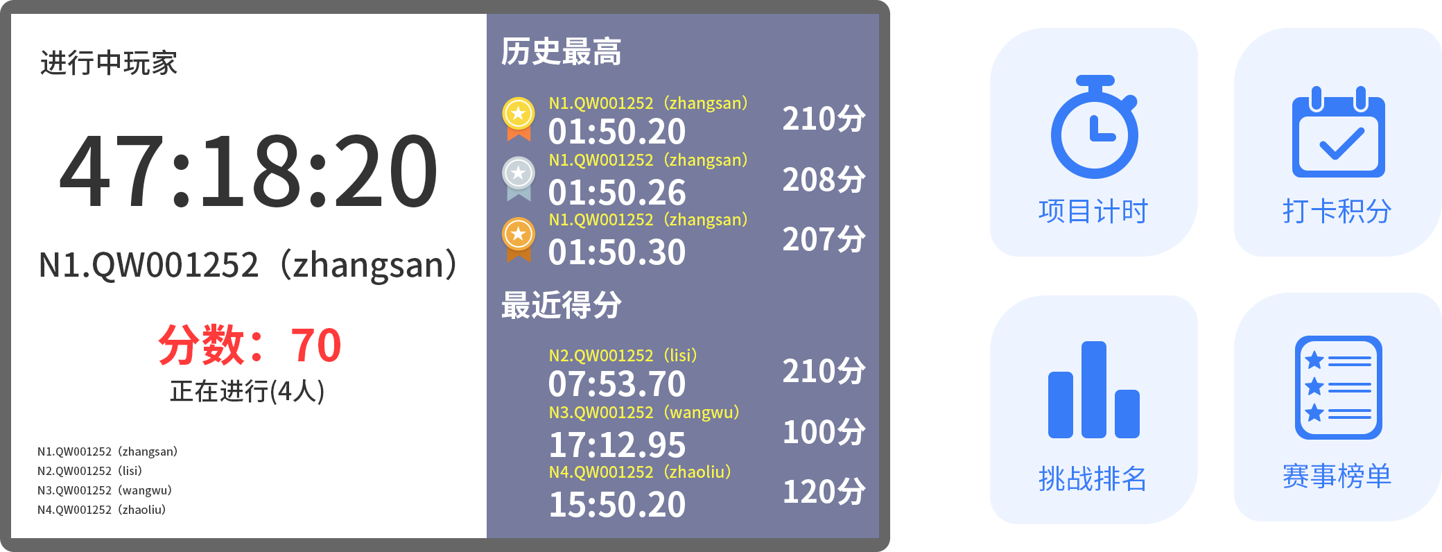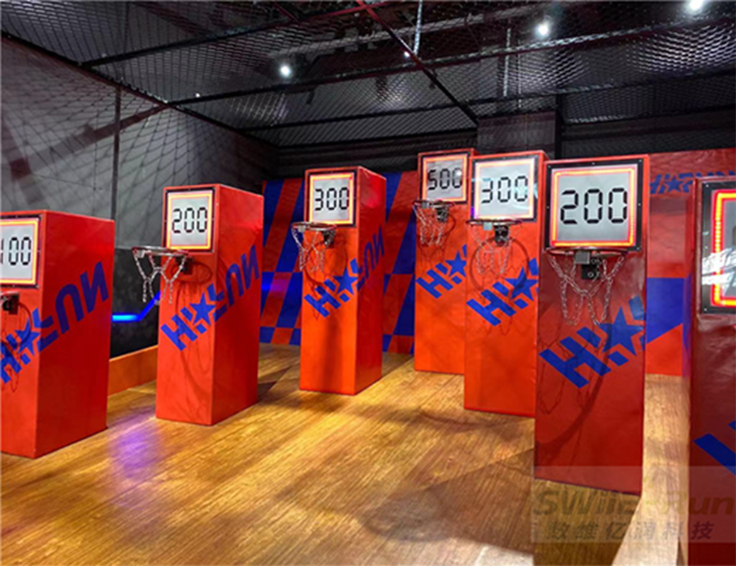 打卡设备安装在得分点上,按设备按钮开始游戏,根据球击中相应得分点获得分数,计分系统自动统计分数,游戏时间结束,得分高者获胜